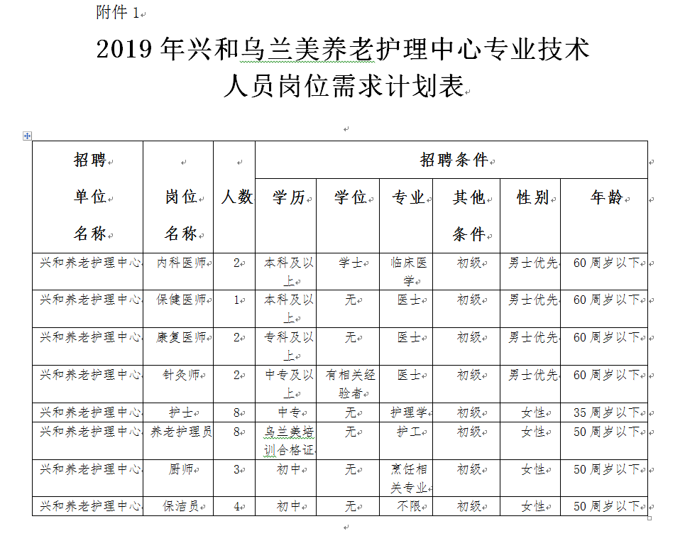 5.戶籍要求截止到2018年11月30日前為烏蘭察布市戶籍。(詳見附件1:2019年興和烏蘭美養(yǎng)老護理中心專業(yè)技術(shù)人員崗位需求計劃表)。