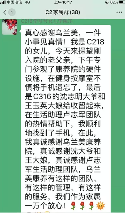 考慮到失主丟失財(cái)物焦急的心情,沈爺爺用餐過后便立即回到房間,正打算挨家挨戶找尋失主時(shí),碰到了前來尋找手機(jī)的C區(qū)二樓生活助理團(tuán)隊(duì)們。“真的特別謝謝大家的熱心幫助,當(dāng)烏蘭美的護(hù)士和生活助理人員知道我的手機(jī)丟失后,都自發(fā)的幫我找尋手機(jī)。我真的感到特別的暖心,特別的貼心。經(jīng)過這次事情,我對(duì)我老父親住在這里一萬個(gè)放心!因?yàn)檫@里的工作人員不僅細(xì)心呵護(hù)、照顧老人,還守護(hù)了他們的財(cái)產(chǎn)安全。”