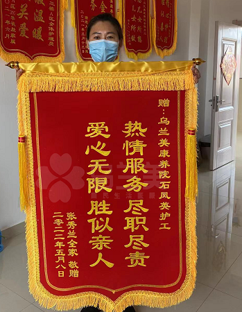 近日,烏蘭美康養(yǎng)院收到了一封致謝院內(nèi)全體工作人員的感謝信和一面送給石鳳英護(hù)理員的錦旗,錦旗上面寫著“熱心服務(wù),盡職盡責(zé),愛心無限,勝似親人”。一句感謝的話語,一面肯定的錦旗都承載了老人家屬對我們服務(wù)的認(rèn)可,讓我們更有一種責(zé)任感和使命感要把這份工作做好。